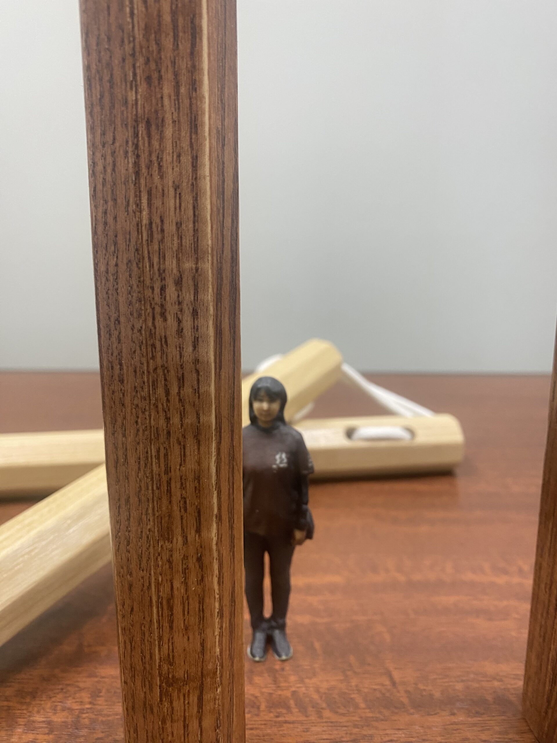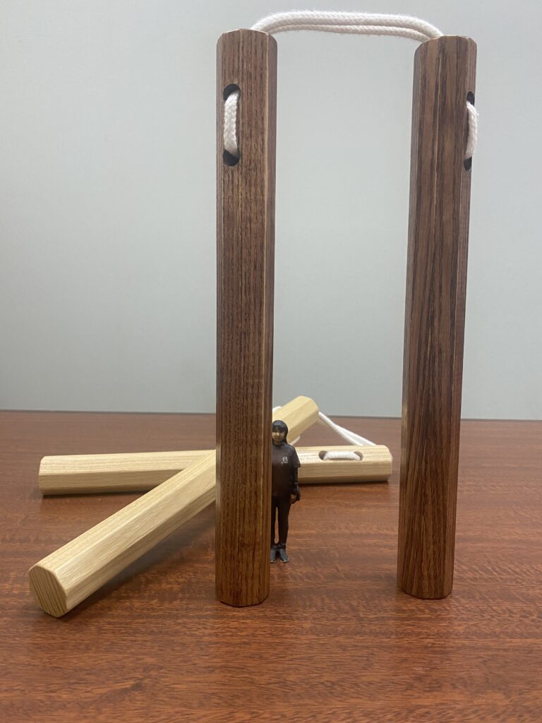 沖縄空手の武具であるヌンチャクの傍に佇むリエコさん。